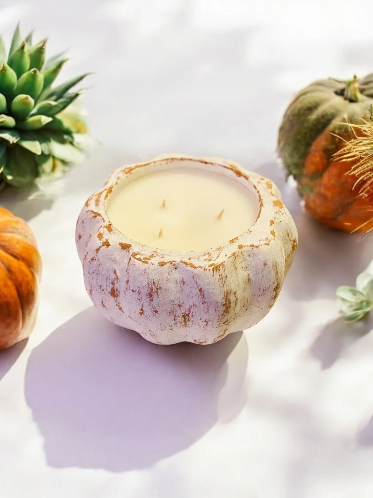 Held in a white pumpkin-shaped handmade clay bowl, this 17-ounce candle adds a seasonal touch that’s perfect for fall decor.